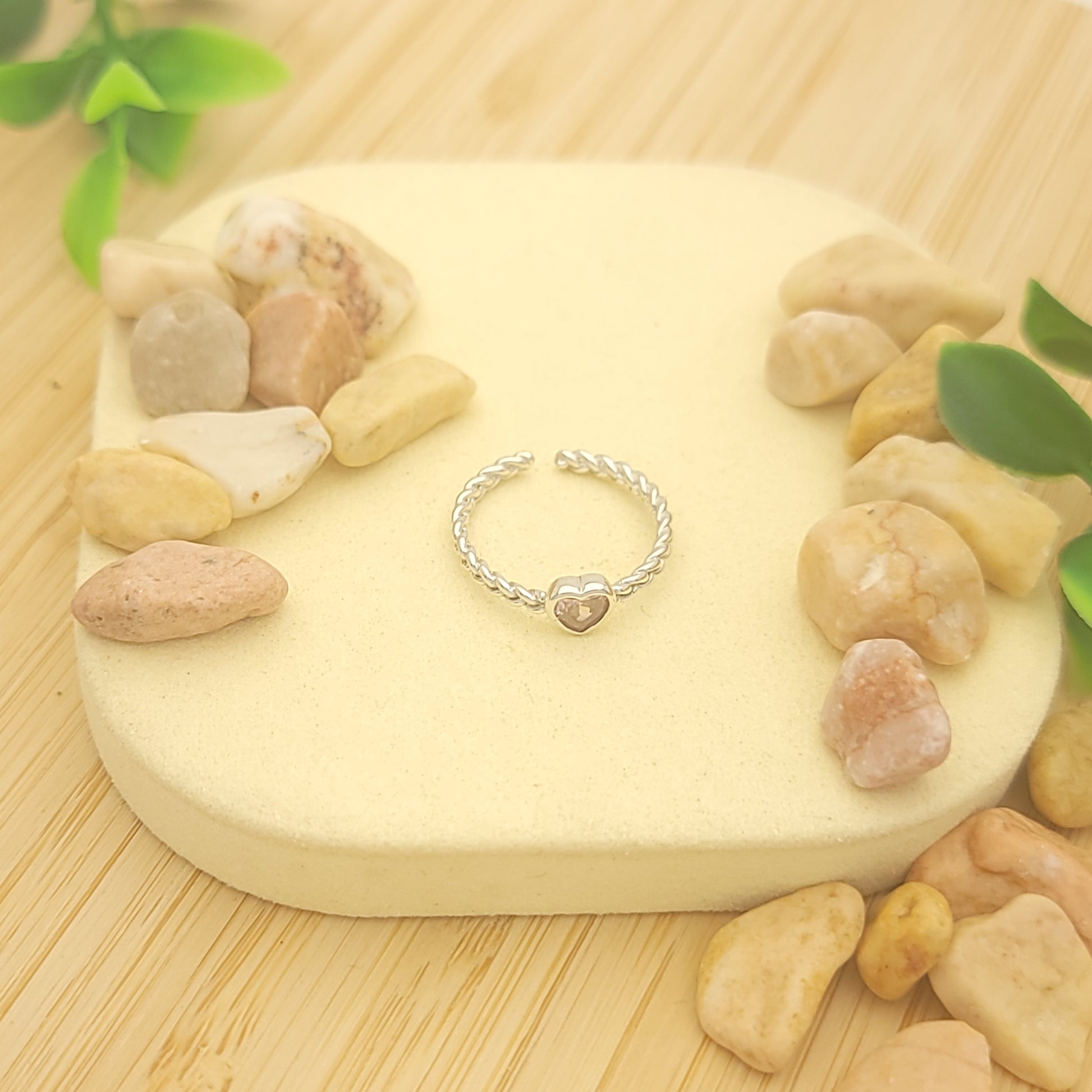 Un delicado anillo en plata 925 con diseño ajustable, realzado por una banda trenzada y un pequeño corazón en el centro que aporta un toque romántico y elegante.