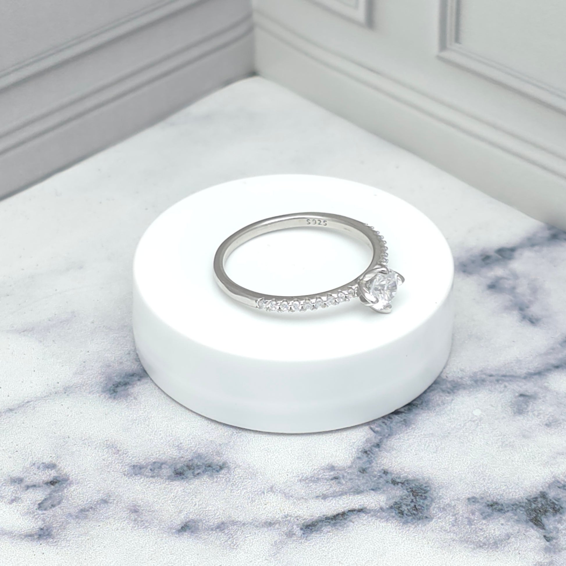 Elegante anillo de plata con una circonia central de corte redondo que resalta por su luminosidad. Su aro fino está decorado con pequeñas piedras incrustadas que aportan un brillo uniforme, creando un diseño atemporal perfecto para compromisos o momentos especiales.