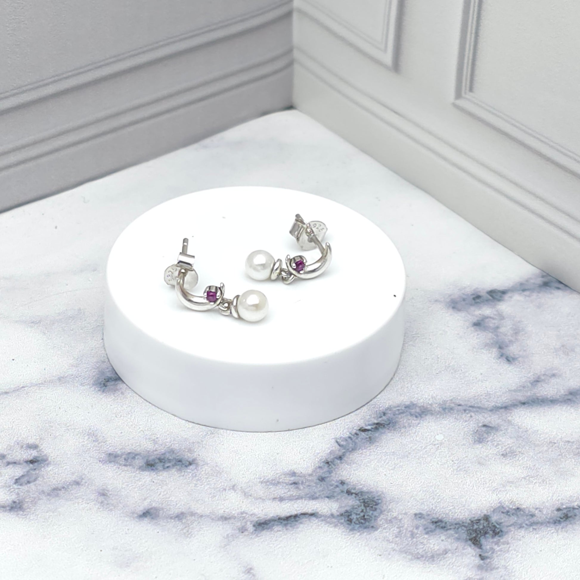 Delicados aretes en plata 925 con diseño de media luna, decorados con una circonia rosada y una perla colgante que aportan un brillo romántico y sofisticado.