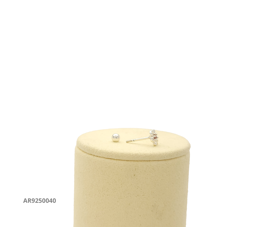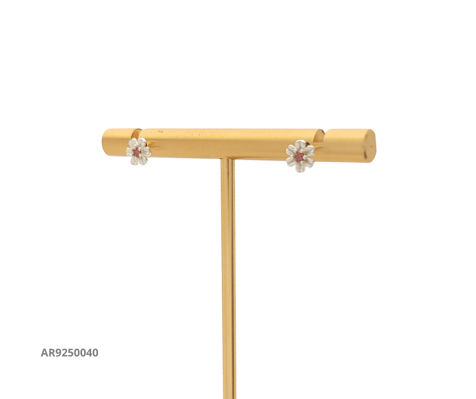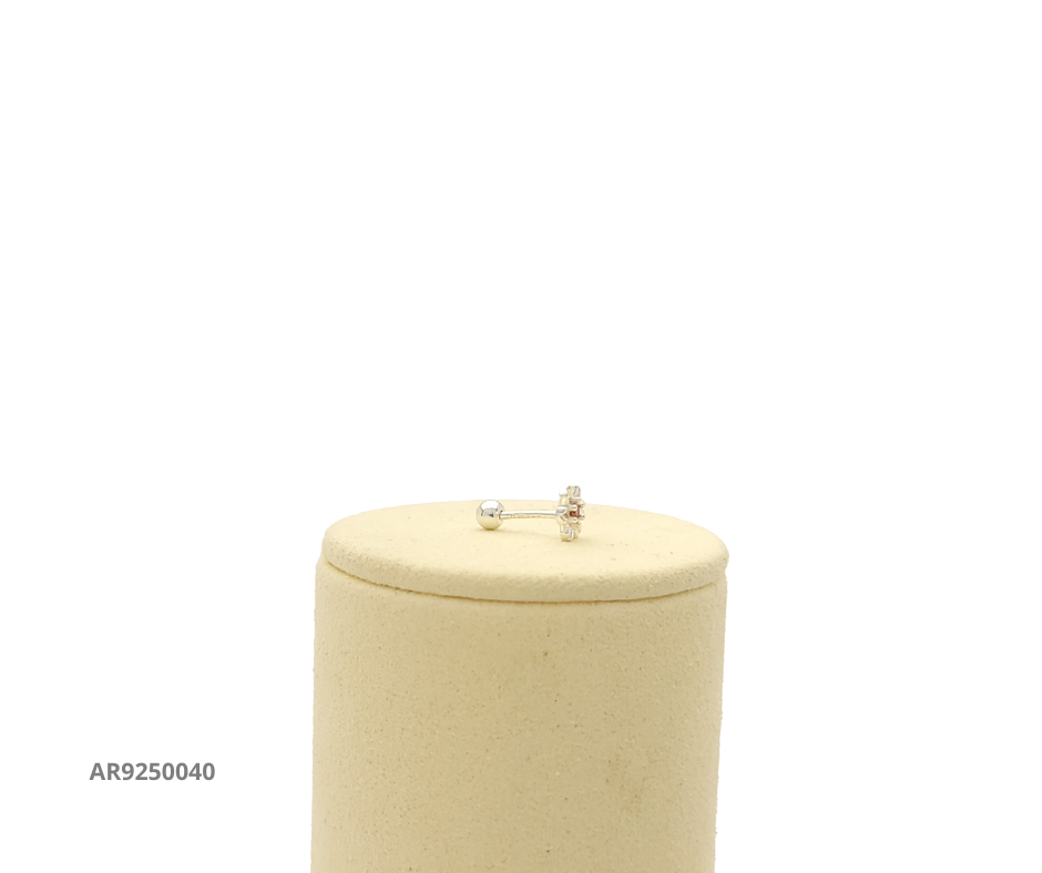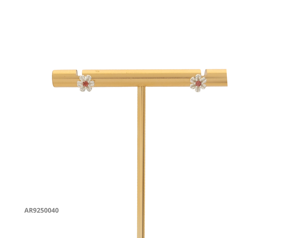 Pequeños y delicados aretes en forma de flor con seis pétalos de plata 925 y una circonia roja en el centro que aporta un detalle colorido y elegante.