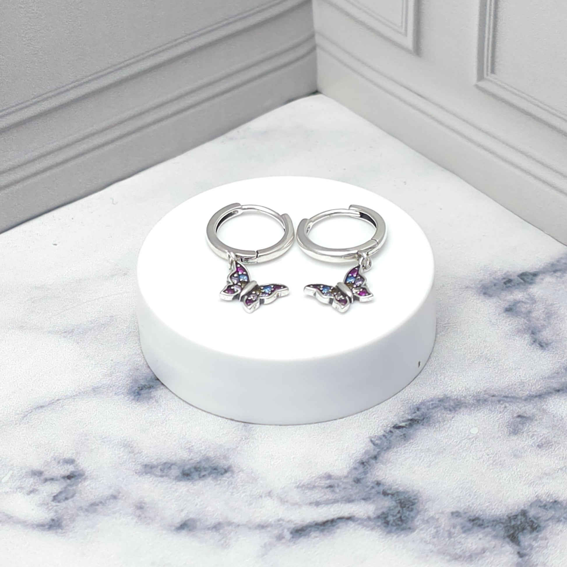 Encantadores aretes de Plata 925 con dije de mariposa esmaltada en tonos lila y azul. Su diseño colgante combina elegancia y frescura, ideal para quienes buscan un toque femenino y moderno en su estilo diario.