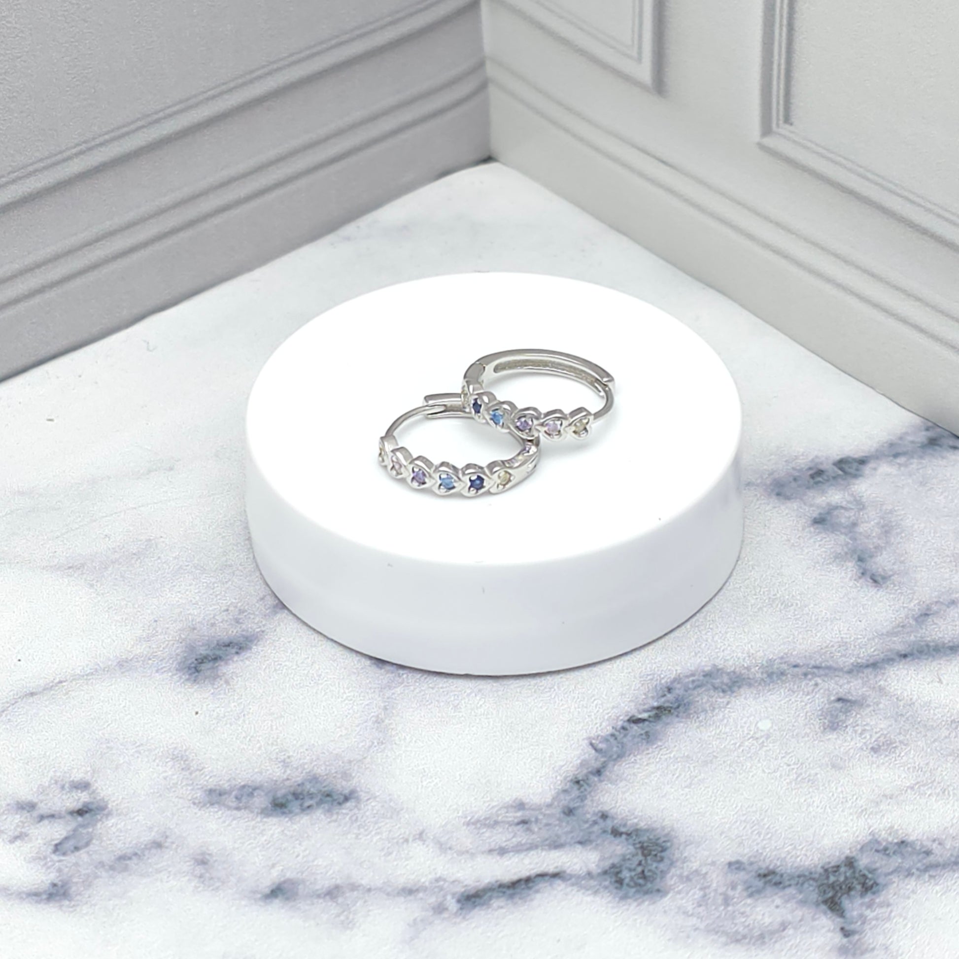 Encantadores aros en plata 925 decorados con pequeñas piedras en forma de corazón en tonos azul, lila y rosa, que aportan color y brillo a un diseño lleno de ternura.