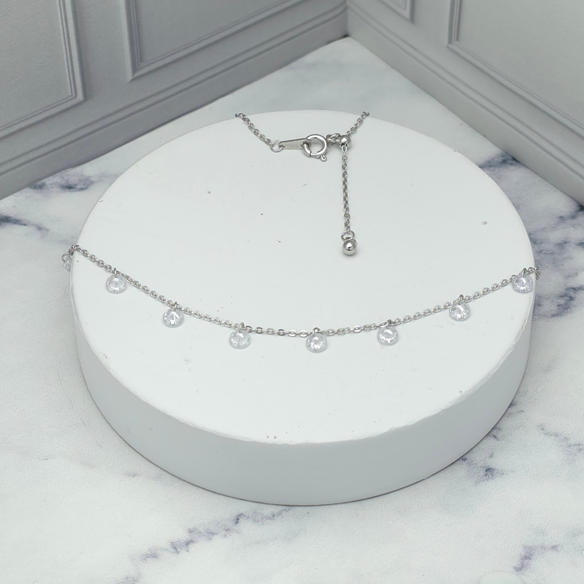 Delicado collar en plata 925 con pequeños dijes de circonia brillante, un diseño sutil y moderno que aporta luminosidad y elegancia a cualquier look.